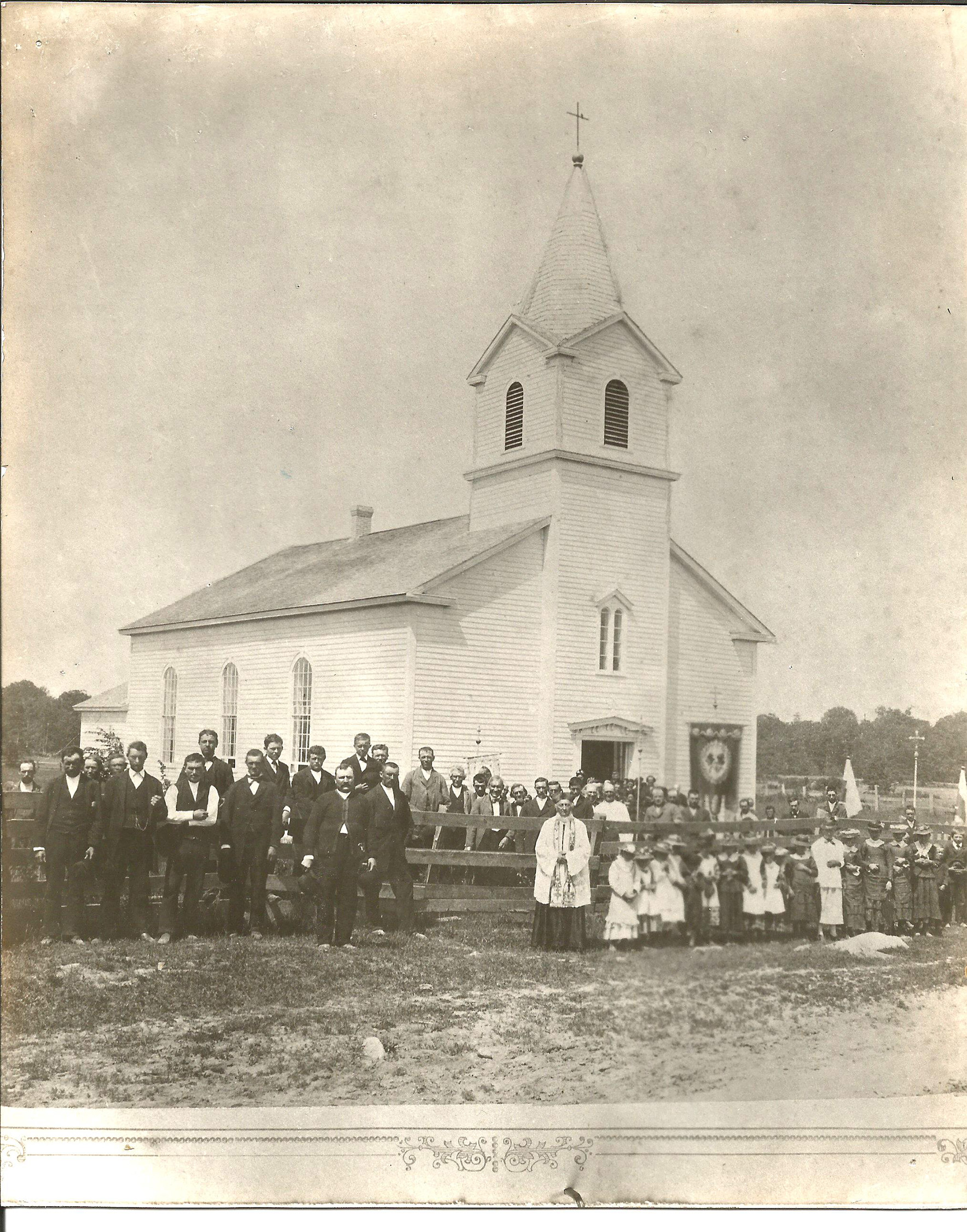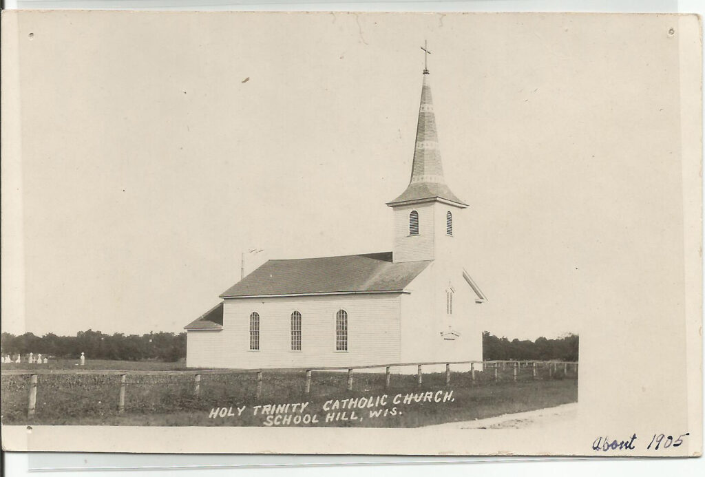School Hill area settlers many of whom belonged to the Roman Catholic religion soon learned they had to travel considerable distance to attend church services. By the year 1869 a movement of 32 area families was underway to build a church. Construction of the church was probably begun that year. Although church records are vague and incomplete, it is believed the church was completed and put into service late in the fall of 1871. The Rev. Ambrose Oschwald of the St. Nazianz settlement presided at the blessing and the church was named Holy Trinity Parish.